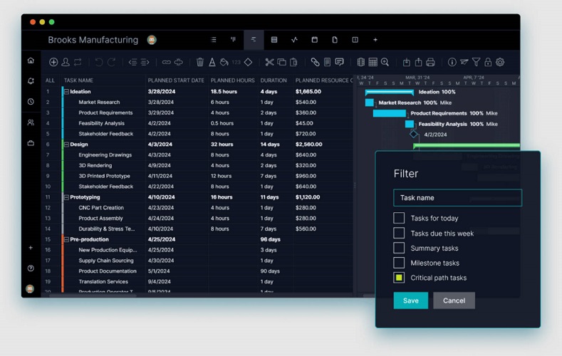 - Calculate the critical path of your project on our online Gantt chart. Load all tasks into the critical path software, assign start and end dates and link task dependencies. Tasks automatically populate on the project timeline. Then, use one of our many filters to automatically show the project’s critical path and immediately know what tasks are a priority.
